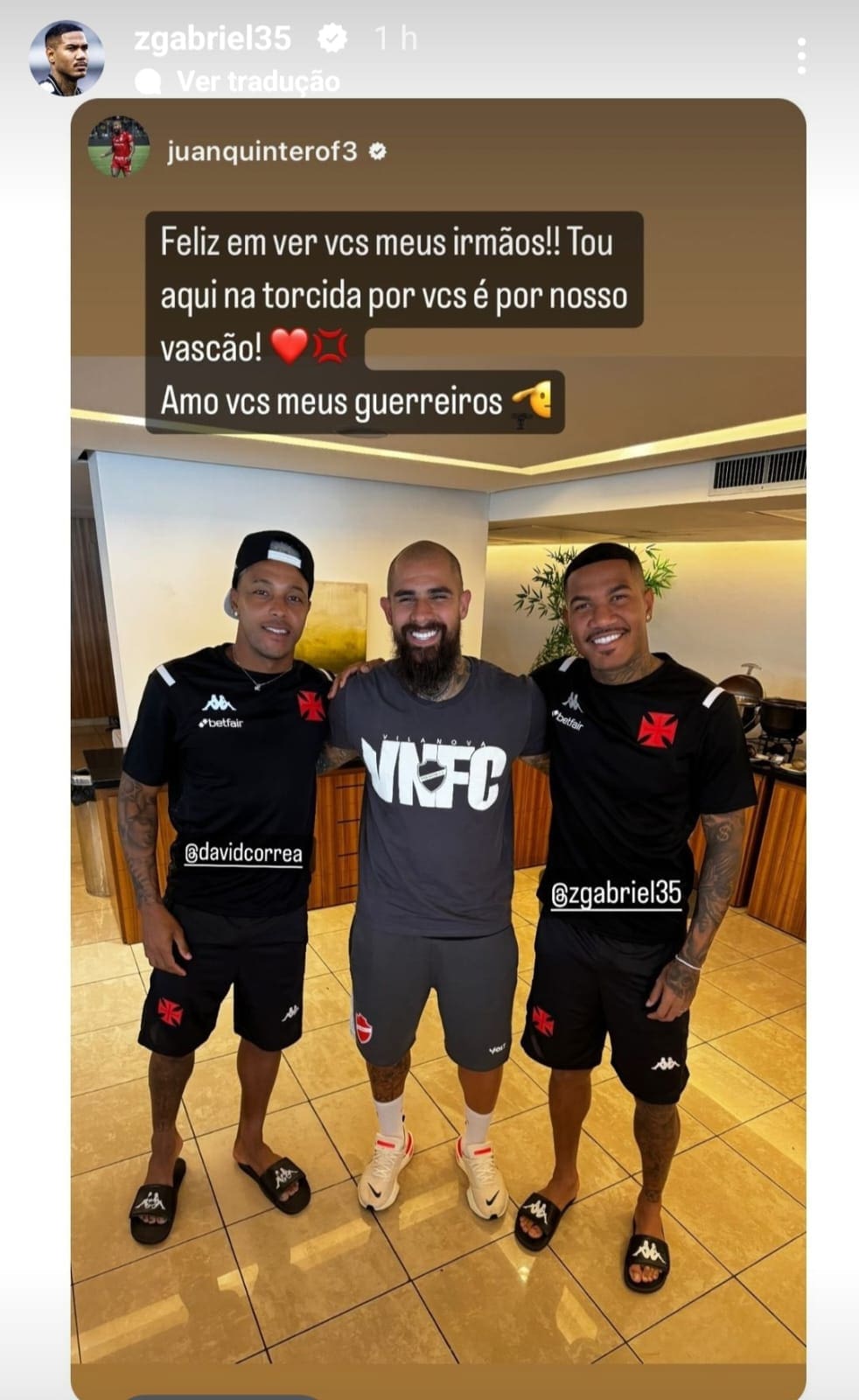 O defensor Quintero, que atua pelo Vila Nova, e o antigo atacante Alex Dias foram vistos hoje na concentração do Vasco, em Goiânia. Ambos defenderam as cores do Gigante da Colina. Quintero compartilhou uma foto ao lado de Zé Gabriel e David, enquanto Alex Dias registrou o momento com o Diretor Técnico, Felipe.