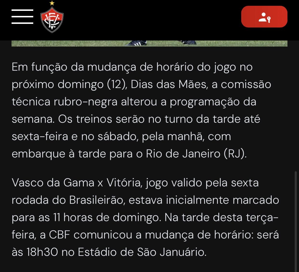 , o confronto entre Vasco e Vitória, inicialmente agendado para as 11h, agora ocorrerá às 18:30h em homenagem ao Dia das Mães.
