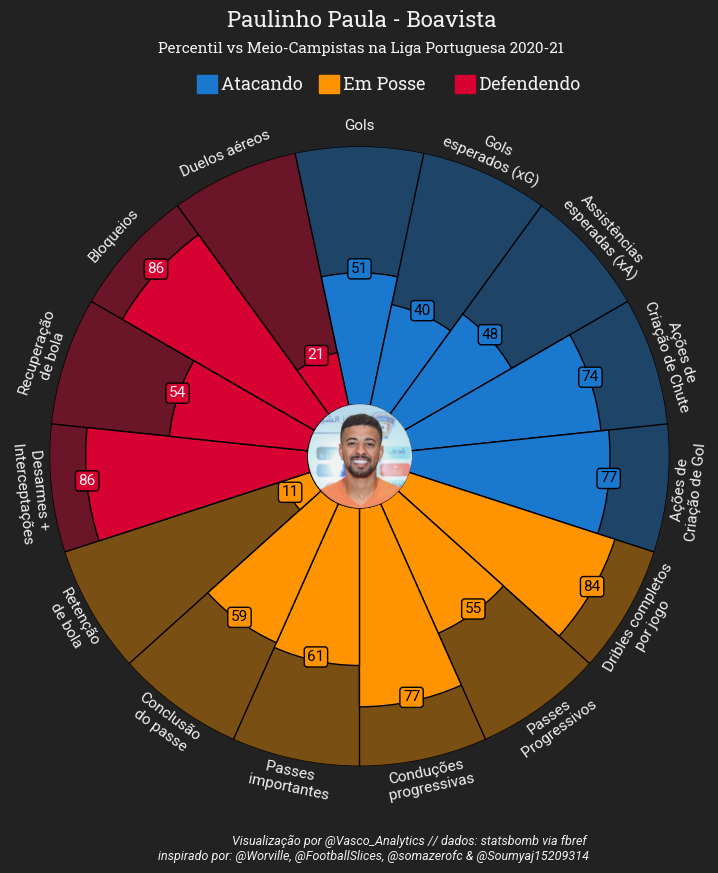 Para responder, analisei a temporada 20/21 em Portugal do atleta e comparei os dados dele com os outros meio campistas da liga no mesmo período ⬇️