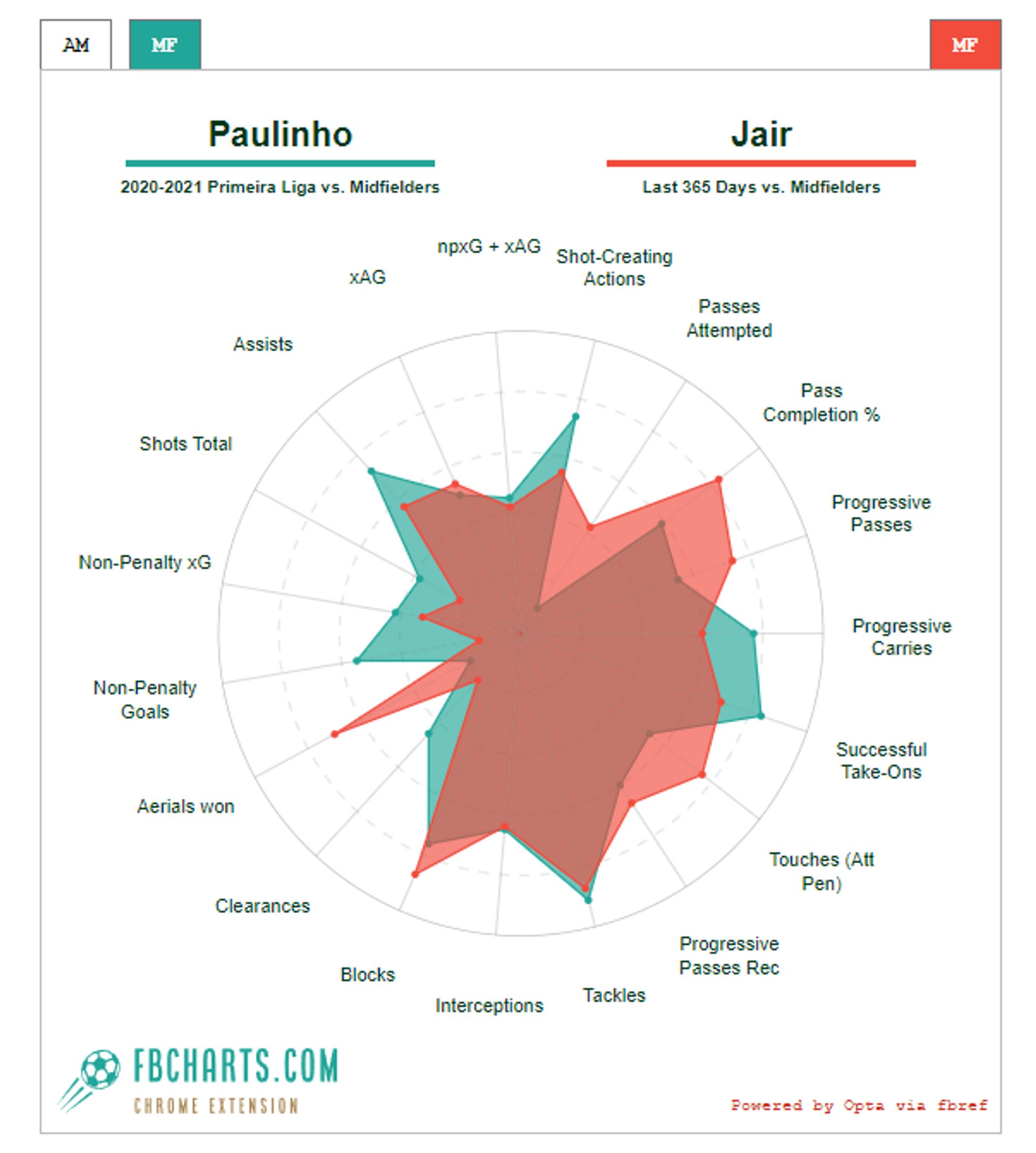 Paulinho progride mais com dribles e conduções que Jair, que contribui mais com passes, mas tem como diferencial subir mais ao ataque como um homem surpresa, como o