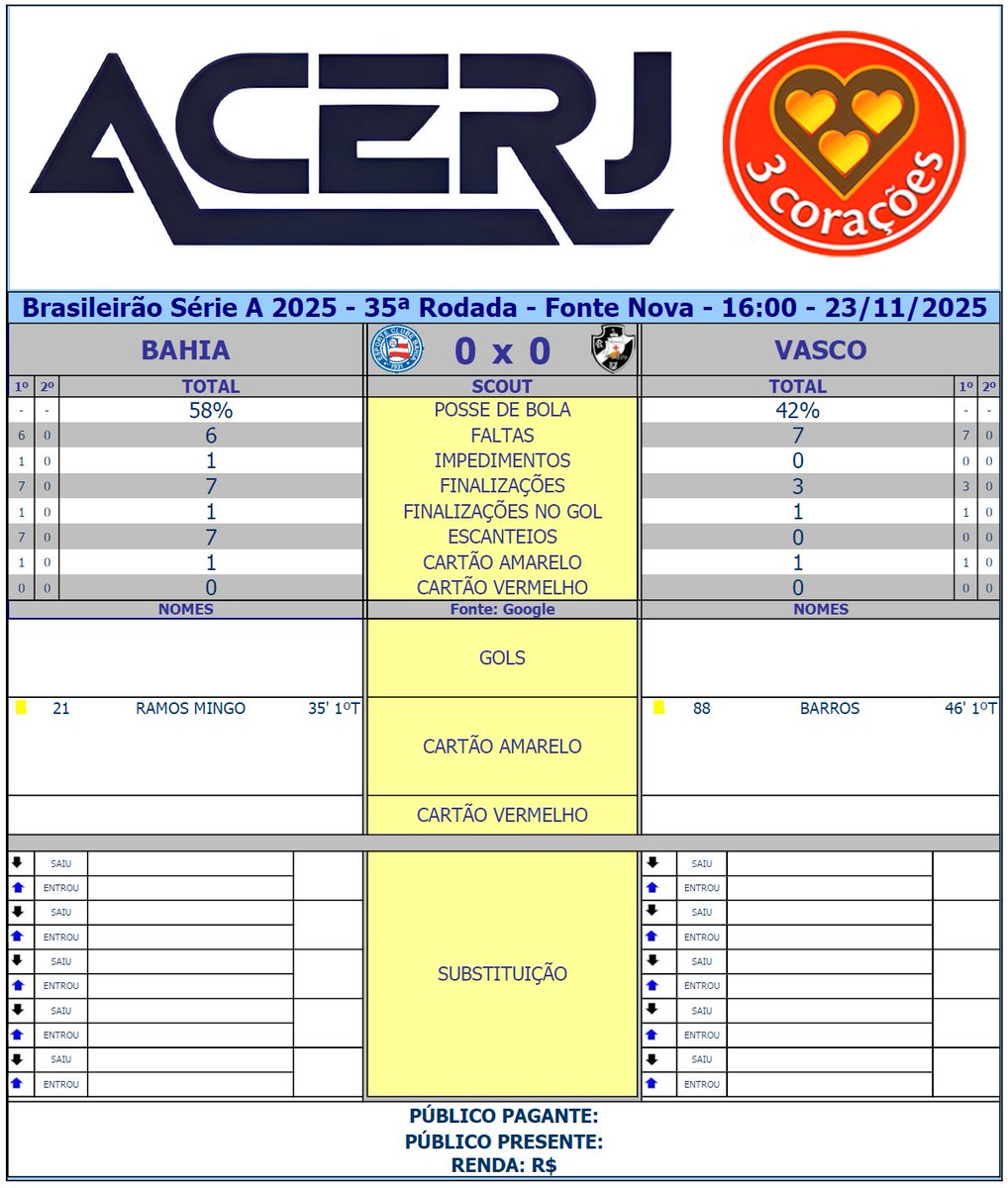 O Scout do 1º Tempo do confronto entre Bahia e Vasco, válido pela 35ª rodada do Campeonato Brasileiro 2025, acontecerá na Arena Fonte Nova. (Fonte: Google) #Acerjinforma #brasileirao2025 #BAHxVAS #ECBahia #VascodaGama @Brasileirao @ecbahia @VascodaGama