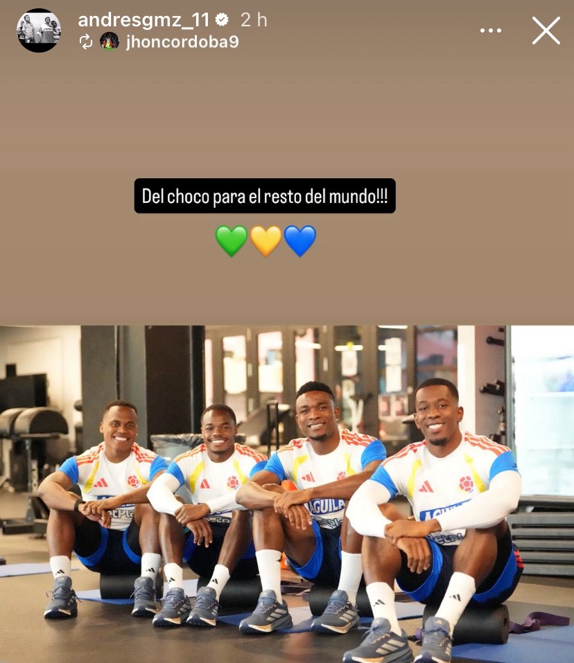 Andrés Gómez e Carlos Cuesta tiram foto ao lado de Jhon Córdoba e Jhon Arias durante o treino da Seleção Colombiana.