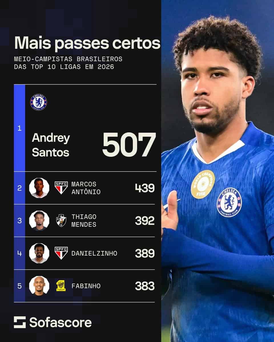 Andrey Santos é o meio-campista brasileiro com mais passes certos nas grandes ligas em 2026, seguido por Thiago Mendes em terceiro lugar.