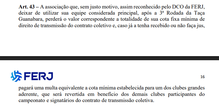 De acordo com o Artigo 43 do regulamento da FERJ, clubes que não utilizarem sua equipe principal, sem uma justificativa reconhecida pelo DCO, após a terceira rodada da competição, podem enfrentar sanções severas.