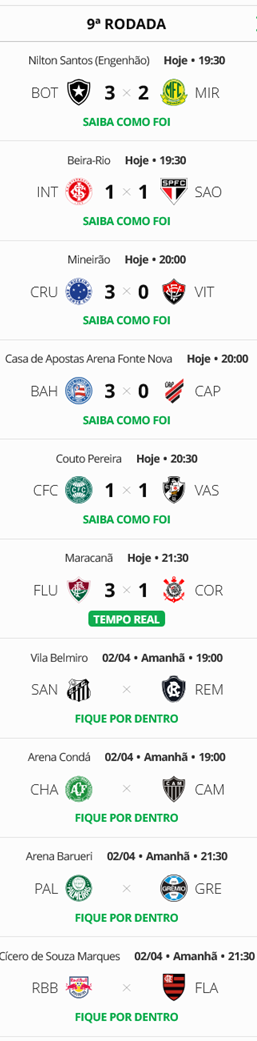 A 9ª rodada do Campeonato Brasileiro teve início nesta quarta-feira, com a realização de seis partidas. O Vasco, que ficou no empate com o Coritiba em 1 a 1, ocupa atualmente a 8ª posição na tabela. Quatro jogos ainda serão disputados na quinta-feira.