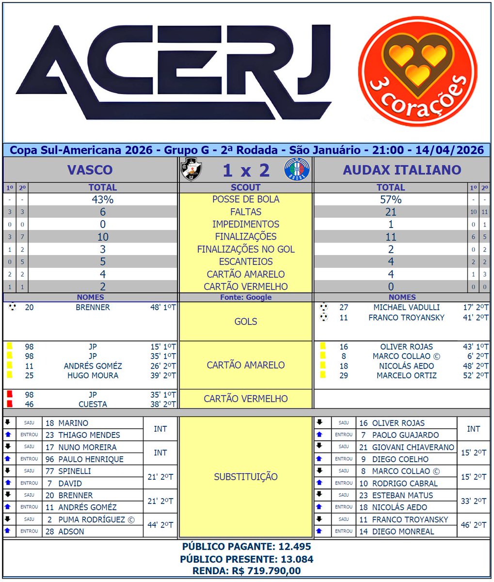 Audax Italiano vence Vasco por 2 a 1; confira as estatísticas do jogo.