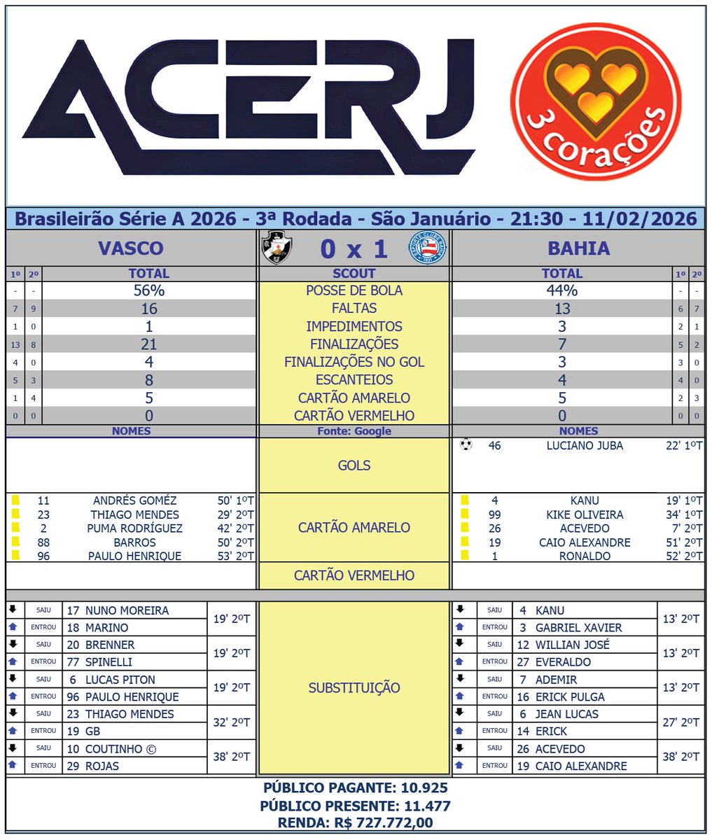 Bahia vence Vasco por 1 a 0; veja os números do confronto