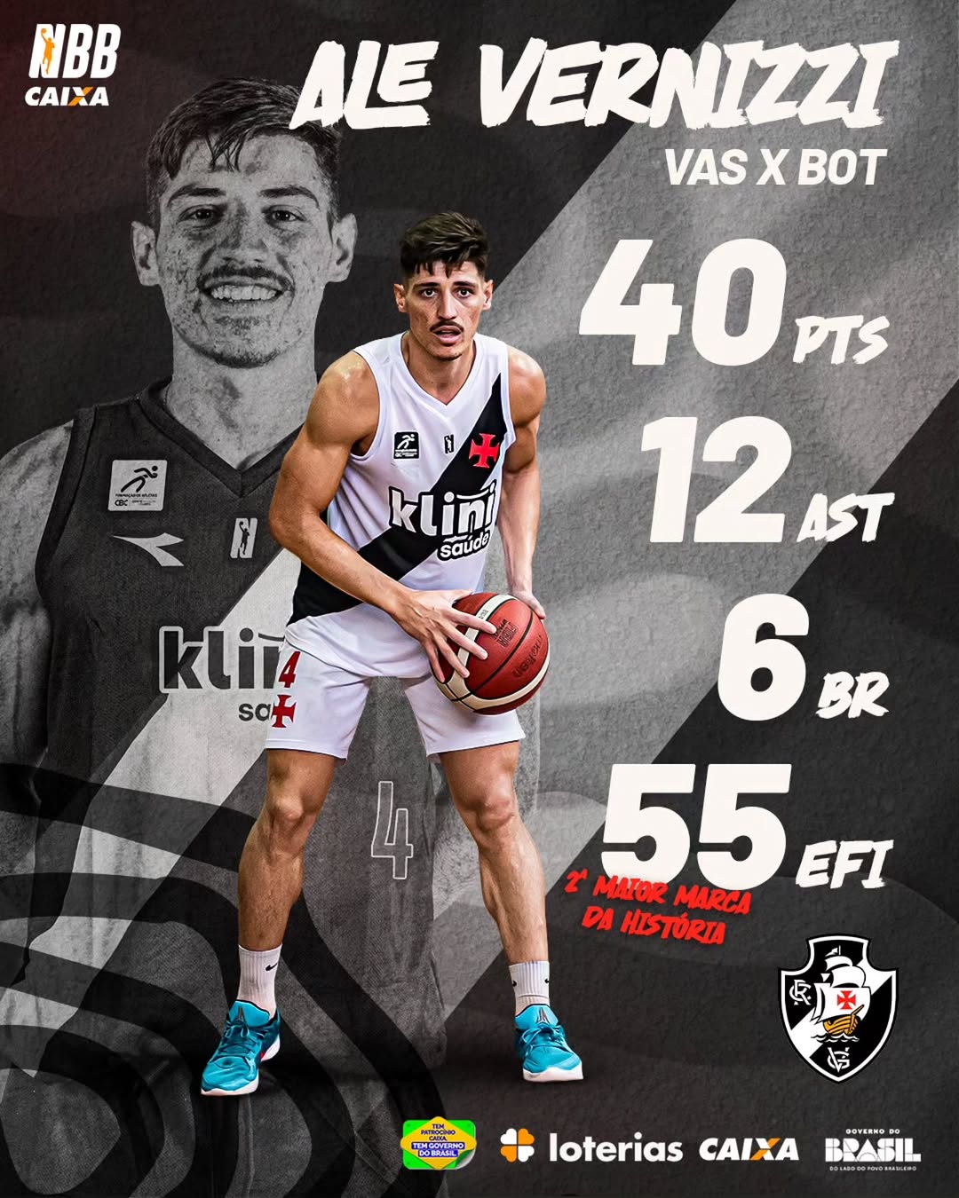 Na partida contra o Botafogo, em São Januário, um dia após completar 26 anos, Alê Vernizzi foi dominante em todos os aspectos do jogo. O armador finalizou o confronto com 40 pontos, 12 assistências, seis rebotes e seis bolas recuperadas, somando impressionantes 55 de eficiência, uma marca que evidencia não apenas o volume ofensivo, mas também o impacto completo nas duas extremidades da quadra.