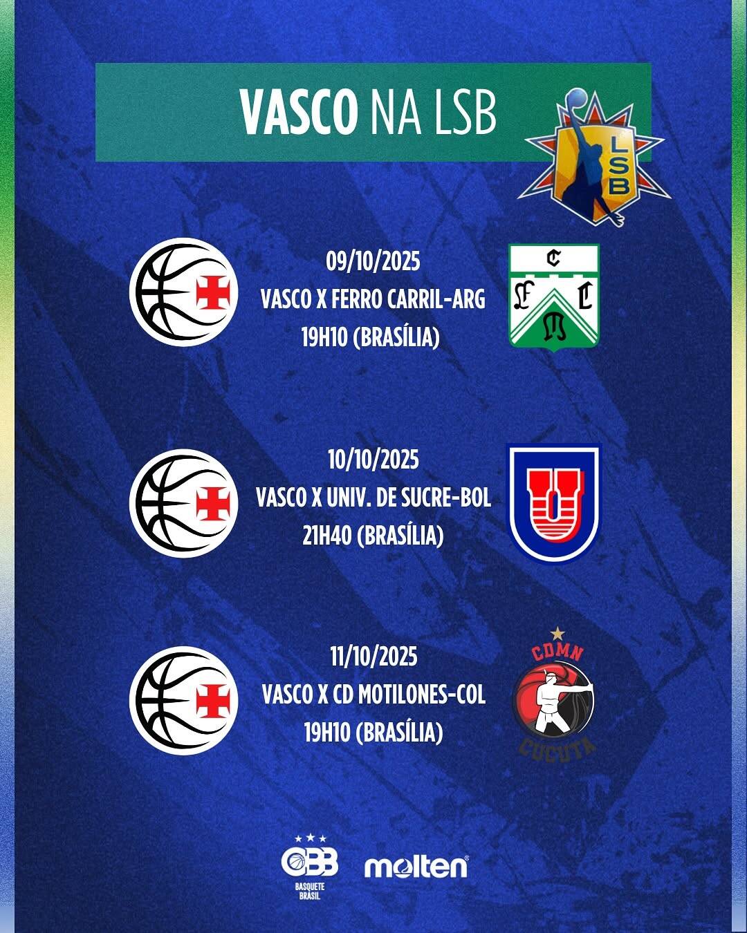 O Vasco retorna às competições continentais de Basquete! O time, conhecido como Gigante da Colina, fará sua estreia no grupo B nesta quinta-feira, em Sucre, na Bolívia, com transmissão ao vivo pelo YouTube da Fiba. Confira a tabela dos jogos, considerando o horário de Brasília: