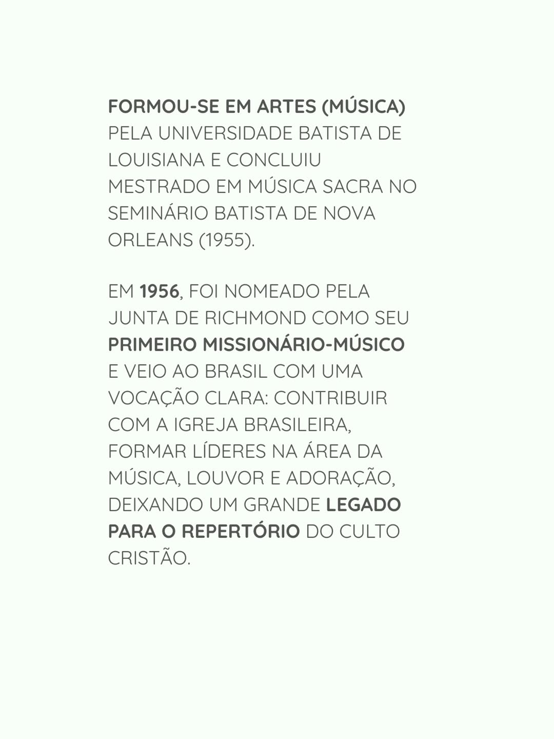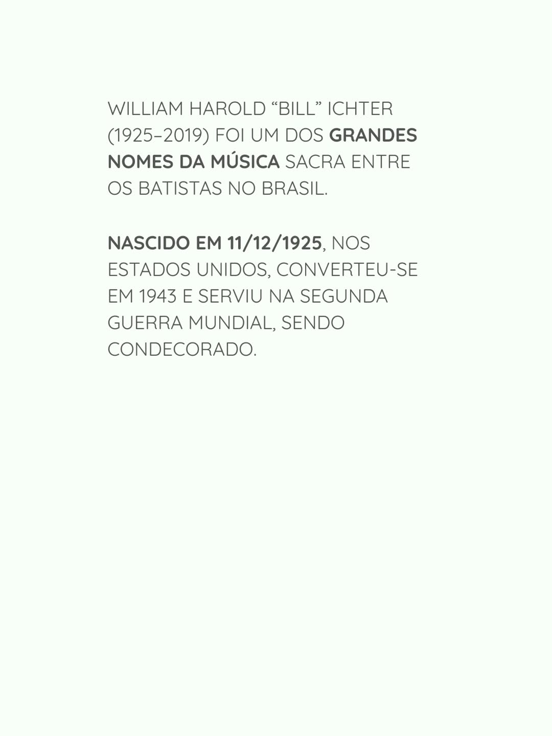 William Harold “Bill” Ichter (1925–2019) nasceu nos Estados Unidos e se converteu em 1943, servindo na Segunda Guerra Mundial, onde foi condecorado. Após graduar-se em Artes (Música) pela Universidade Batista de Louisiana, completou seu mestrado em Música Sacra no Seminário Batista de Nova Orleans em 1955. Em 1956, Ichter foi nomeado pela Junta de Richmond como o primeiro missionário-músico a atuar no Brasil, com a missão de contribuir para o desenvolvimento da música na igreja brasileira, formando líderes e deixando um legado significativo que ainda ressoa nos cultos cristãos.