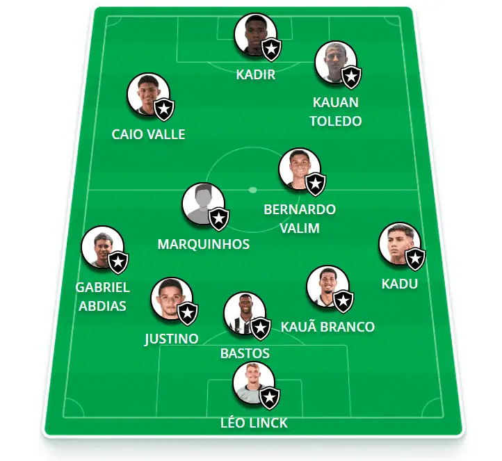 Escalação provável: Léo Linck, Bastos, Kauã Branco (Barboza) e Justino; Kadu, Marquinhos, Bernardo Valim, Gabriel Abdias; Caio Valle, Kauan Toledo e Kadir.