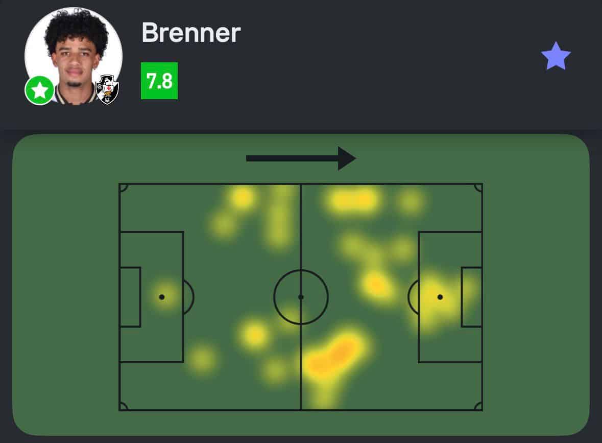 Brenner foi o destaque do jogo entre Vasco e Botafogo, que terminou com a vitória do Vasco por 2 a 0. O jogador anotou 1 gol e teve 12 passes certos em 17 tentativas. Além disso, realizou 2 finalizações, sendo uma delas no gol, e sofreu 1 pênalti. A nota recebida por sua atuação foi 7.8.
