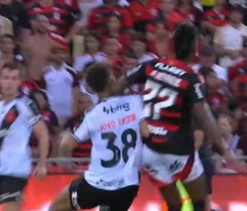 Bruno Henrique atingiu João Victor com uma cotovelada, porém a arbitragem não aplicou cartão ao atacante do time rubro-negro.