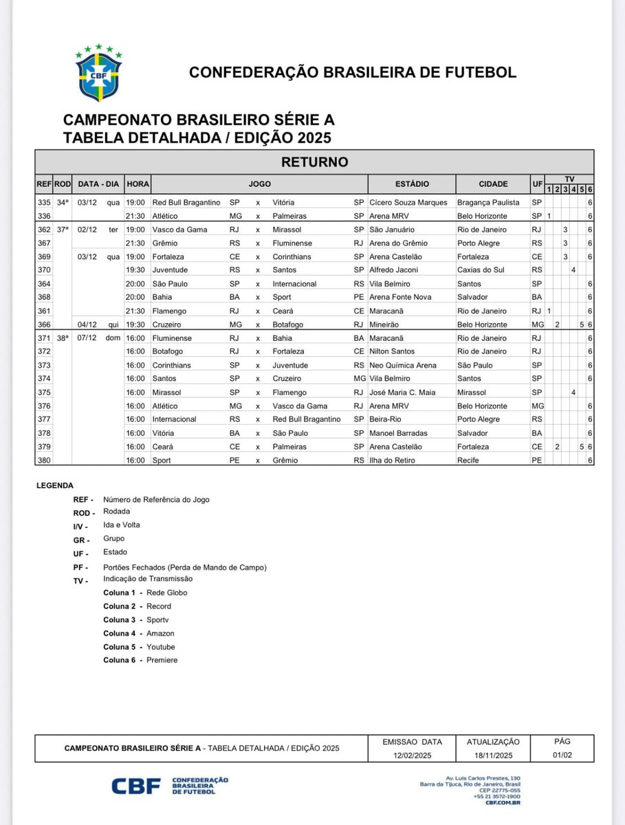 A CBF anunciou o sorteio das últimas rodadas do Campeonato Brasileiro. O confronto entre Flamengo e Ceará está agendado para o dia 3 de dezembro, quarta-feira, às 21h30. A partida decisiva contra o Mirassol, que pode determinar o campeão, ocorrerá no domingo, 7 de dezembro, às 16h. Nesta rodada final, todos os jogos serão realizados simultaneamente.