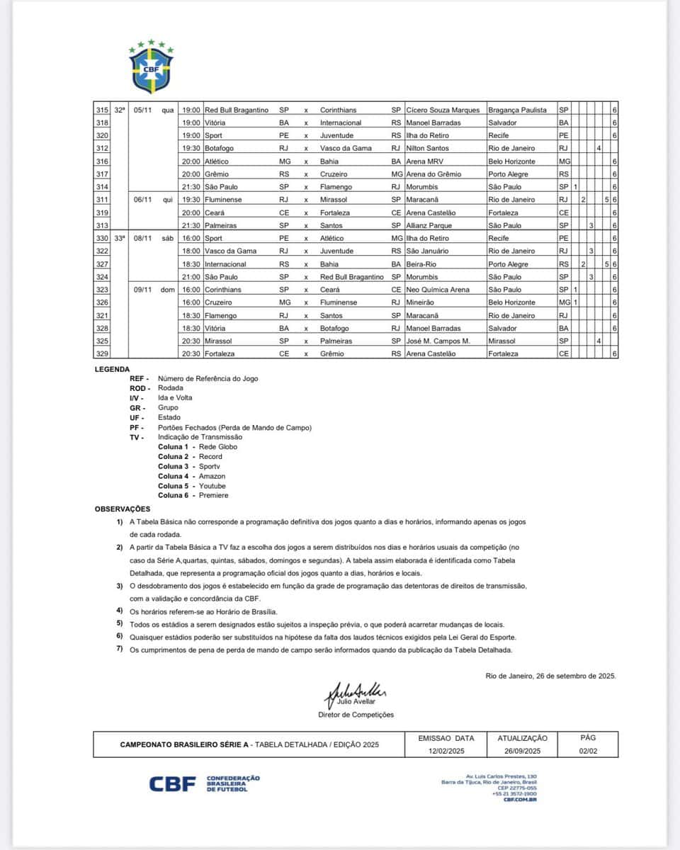 MeuVasco›Últimas notícias›CBF revela informações sobre as rodadas 28 a 33 do… CBF revela informações sobre as rodadas 28 a 33 do Campeonato Brasileiro. sexta-feira, 26/09/2025 às 20:57 • Deixe um comentário wellington campos @wellingcampos Tabela Série A: Fonte: X do jornalista Wellington Campos/Rádio Tupi Receba notícias do Vasco Cadastre seu e-mail para receber os principais destaques do Vasco. Seu e-mail Quero receber Você pode cancelar a inscrição quando quiser. Tags #brasileirão #Brasileiro #Campeonato Brasileiro #Crvg #GiganteDaColina #Meuvasco #Notícias #Vasco #VascoDaGama