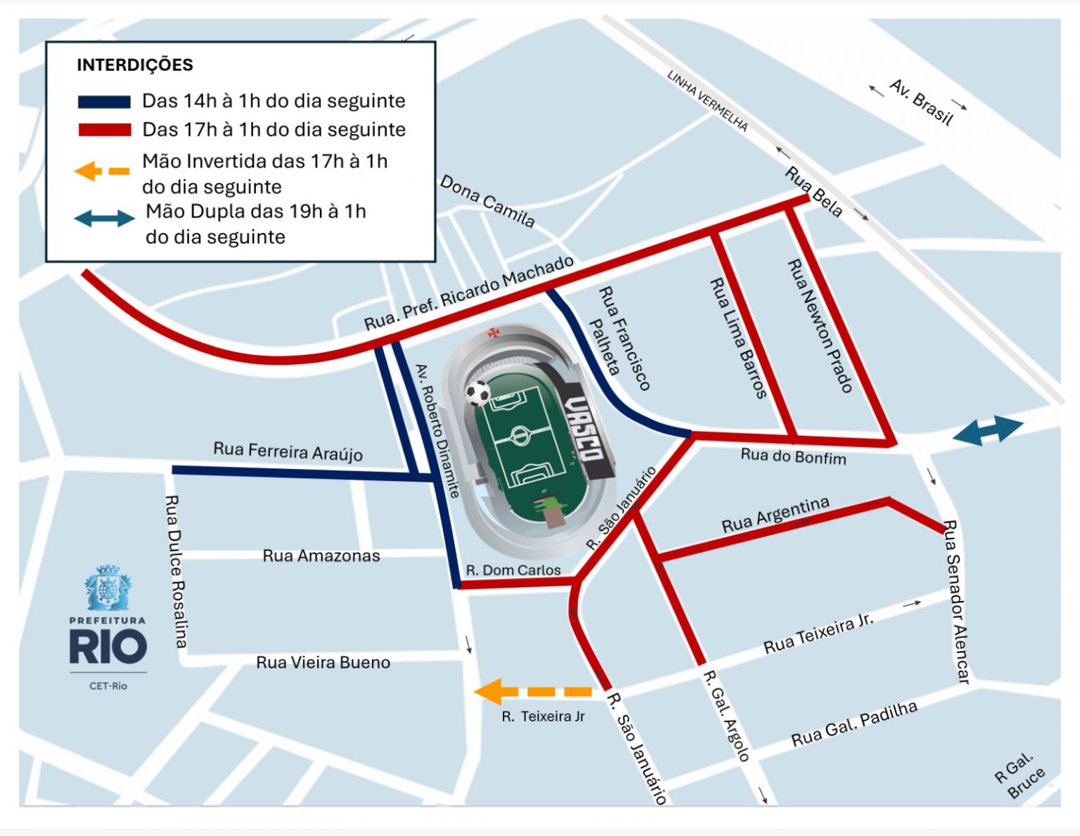 – Rua do Bonfim, no sentido ao Estádio de São Januário, entre a Rua Newton Prado e a Rua São Januário