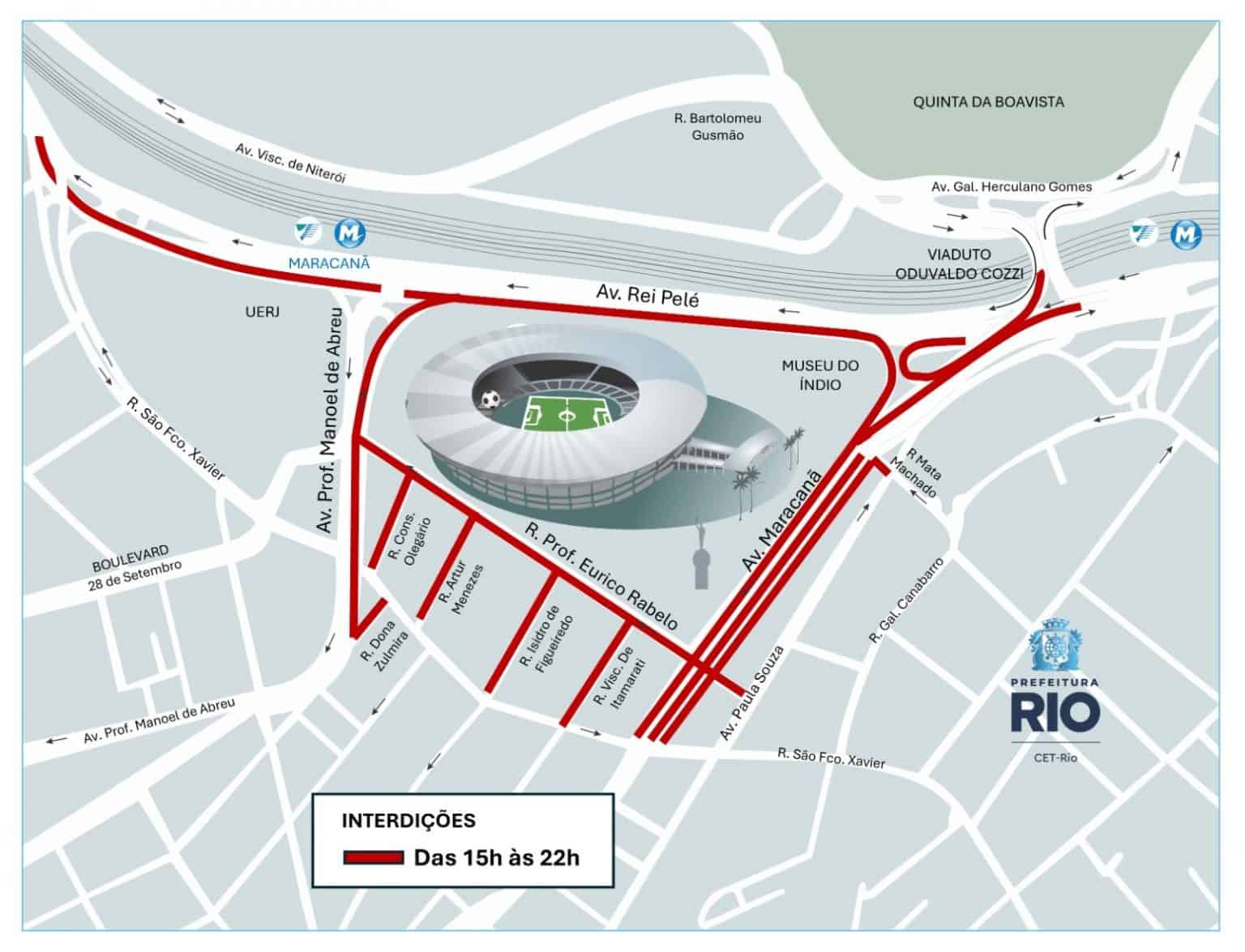 Principais acessos ao estádio serão interditados das 15h às 22h neste domingo (01/03). Arte: CET-Rio