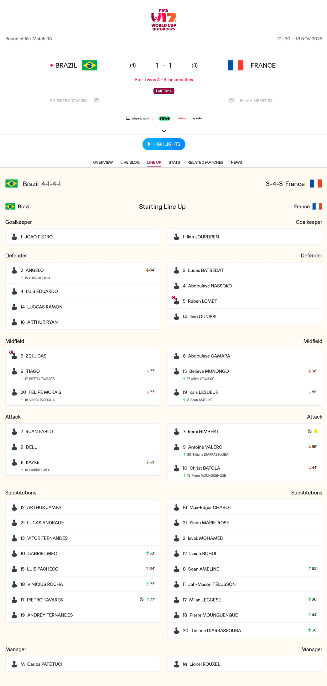Com essa vitória, a equipe francesa retorna para casa, enquanto o Brasil aguarda o vencedor do confronto entre Marrocos e Mali. A Seleção se mantém invicta, tendo vencido Honduras e Indonésia e empatado com Zâmbia, Paraguai e França, avançando nos pênaltis nas duas últimas partidas.