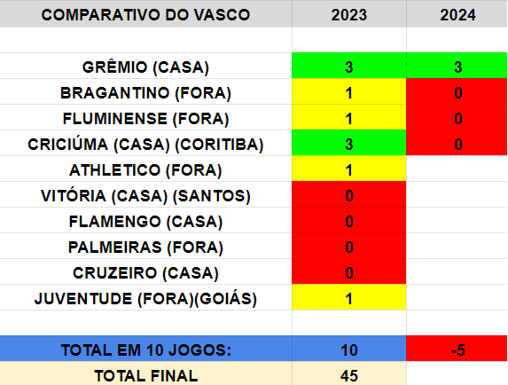 Desde a primeira rodada do Brasileiro, venho acompanhando uma projeção que elaborei para analisar os desempenhos do Vasco em 2023 e 2024. A proposta é comparar os resultados contra os mesmos adversários e sob as mesmas condições. Neste momento, o Vasco já acumula 5 pontos a menos em relação ao mesmo período de 2023. No ano passado, a equipe empatou com Bragantino e Fluminense fora de casa, e venceu o Coritiba em seu estádio. Já em 2024, foram três derrotas diante dos mesmos adversários – Criciúma, atual terceiro colocado da Série B, seria o equivalente ao Coxa, que estava na 19ª posição na Série A. Isso demonstra que, se no ano anterior a luta foi intensa, com 45 pontos conquistados e a classificação se consolidando faltando apenas 10 minutos para o fim do campeonato, o início em 2024 acende o alerta de forma bem mais precoce.