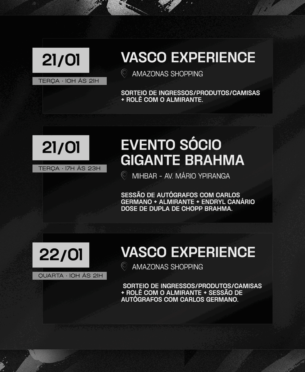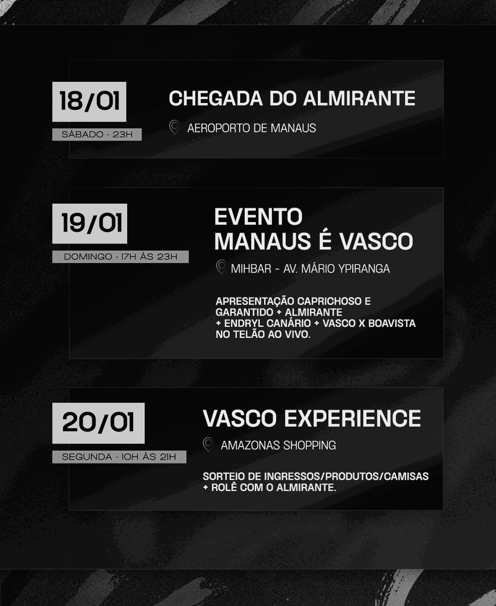 🗓️ Fique ligado no calendário das atividades que vão rolar na semana do jogo Vasco x Madureira em Manaus! ⬇️