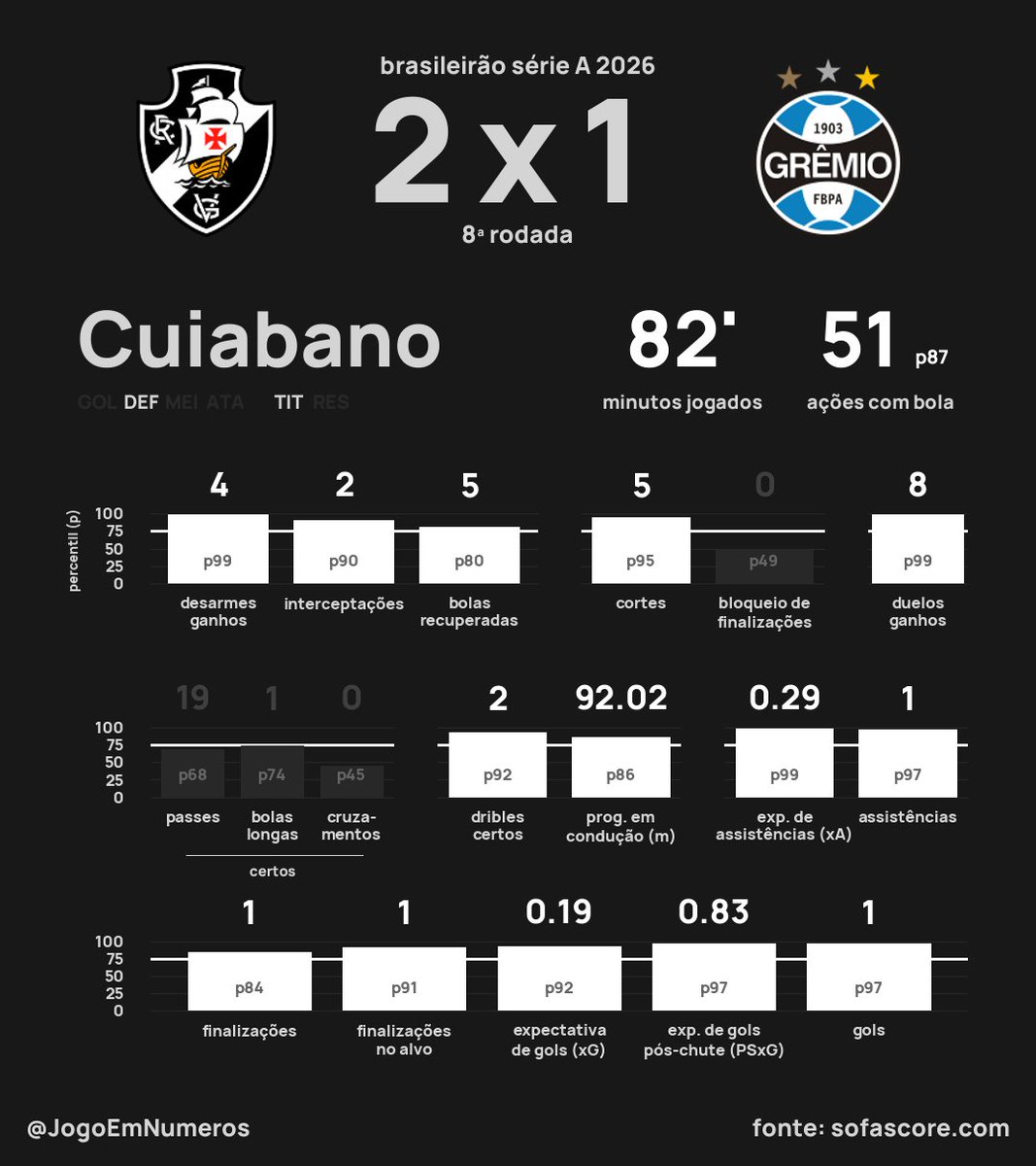 Cuiabano teve atuação destacada em jogo contra o Grêmio, com estatísticas relevantes.