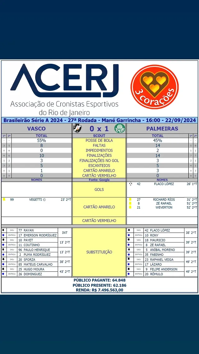 Confira as estatísticas do jogo Vasco 0 x 1 Palmeiras.