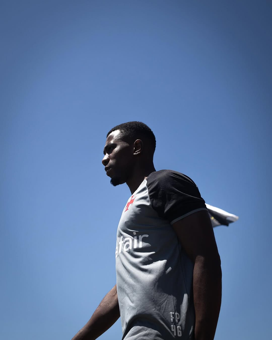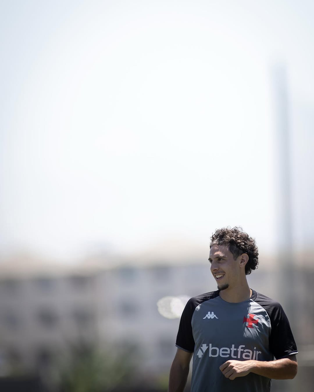 Foto de jogador do Vasco em ação no campo com fundo desfocado. Vasco clube, jogador sorrindo, treino ao ar livre, camiseta cinza com detalhes pretos, patrocinador Betfair. Jogador do Vasco em perfil, com uniforme cinza e preto, sob céu azul claro. Jogadores do Vasco sorrindo ao ar livre.