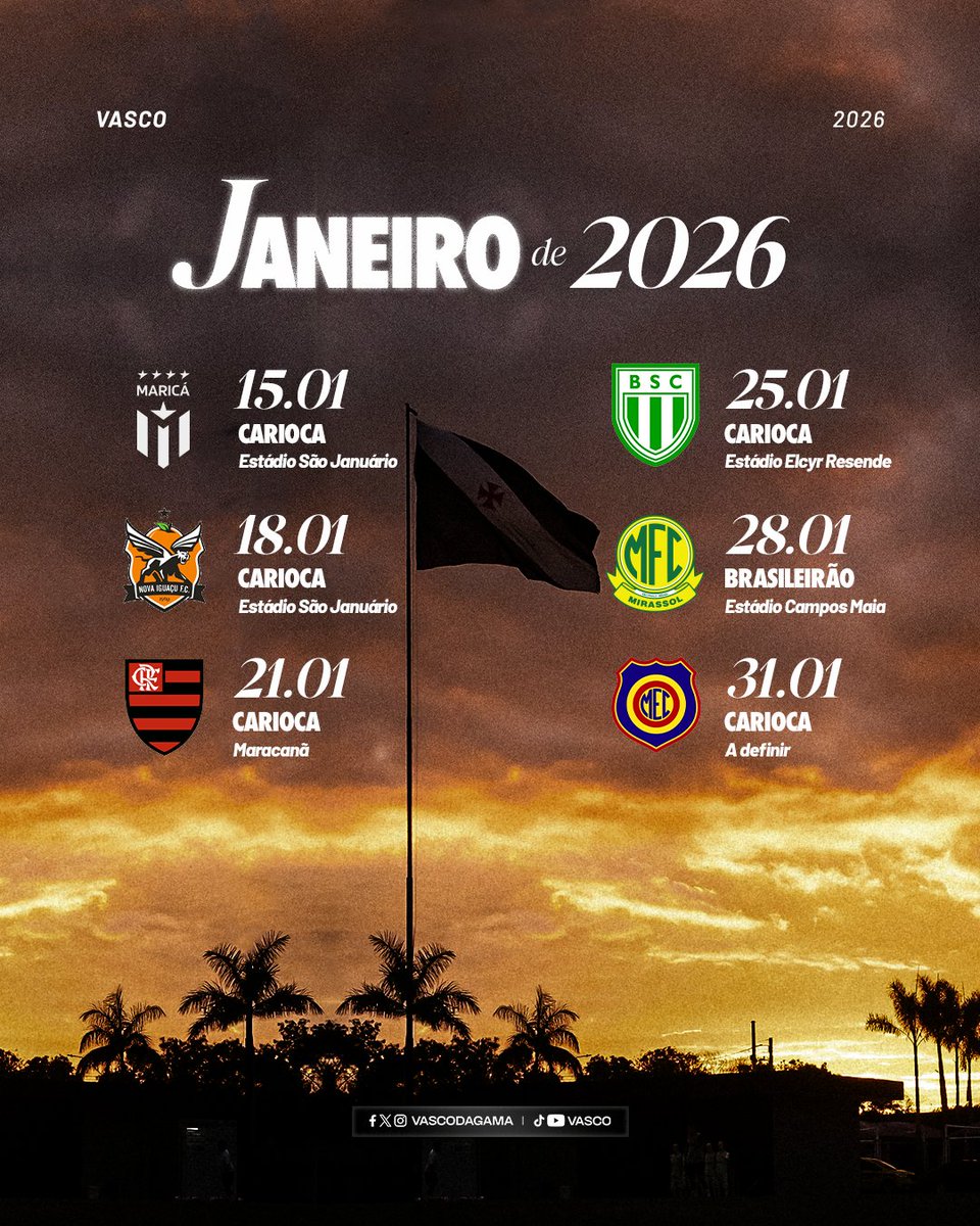 Vasco da Gama @VascodaGama A temporada 2026 está prestes a começar! Confira o calendário de janeiro do Gigante da Colina. 📸: Matheus Lima | #VascoDaGama