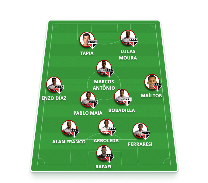 Provável escalação: Rafael, Alan Franco, Arboleda e Ferraresi; Maílton, Pablo Maia, Bobadilla, Marcos Antônio e Enzo Díaz; Lucas Moura e Tapia.