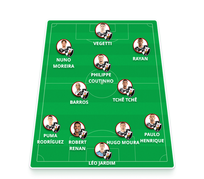A provável escalação do Vasco é: Léo Jardim, Paulo Henrique, Hugo Moura, Robert Renan, Puma Rodríguez, Barros, Tchê Tchê; Coutinho, Nuno Moreira, Rayan e Vegetti.