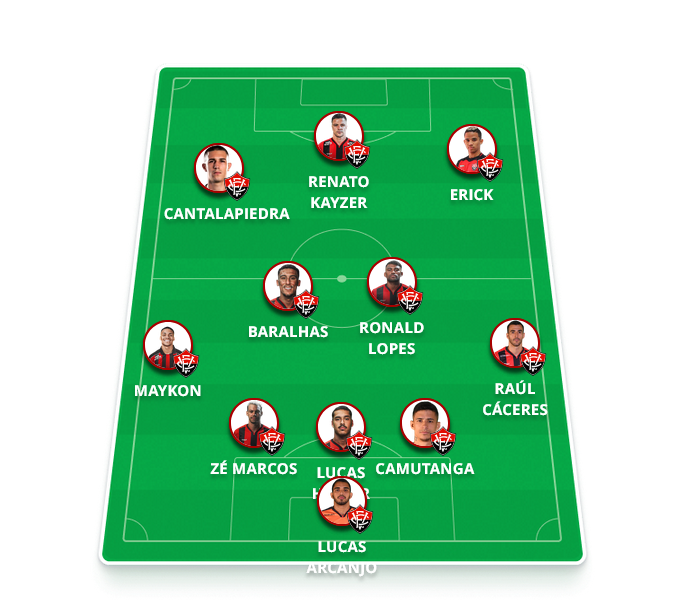 A escalação provável do Vitória é: Lucas Arcanjo, Lucas Halter, Camutanga e Zé Marcos; Raúl Cáceres, Baralhas, Ronald e Maykon Jesus; Erick, Aitor Cantalapiedra e Renato Kayzer.