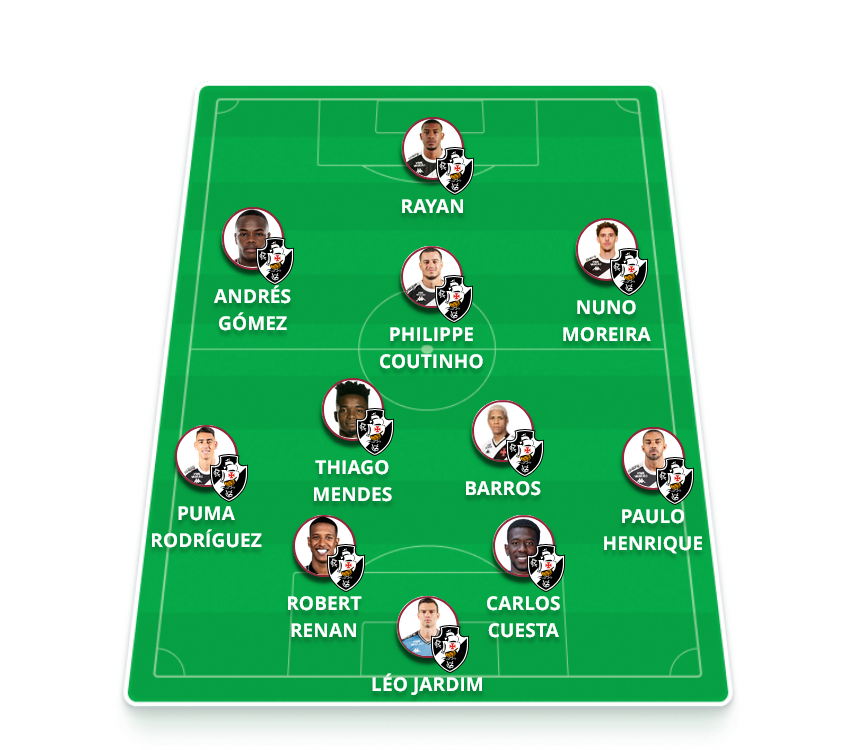 A provável escalação do Vasco: Léo Jardim, Paulo Henrique, Carlos Cuesta, Robert Renan e Puma Rodríguez; Barros, Thiago Mendes e Coutinho; Nuno Moreira, Andrés Gómez e Rayan.