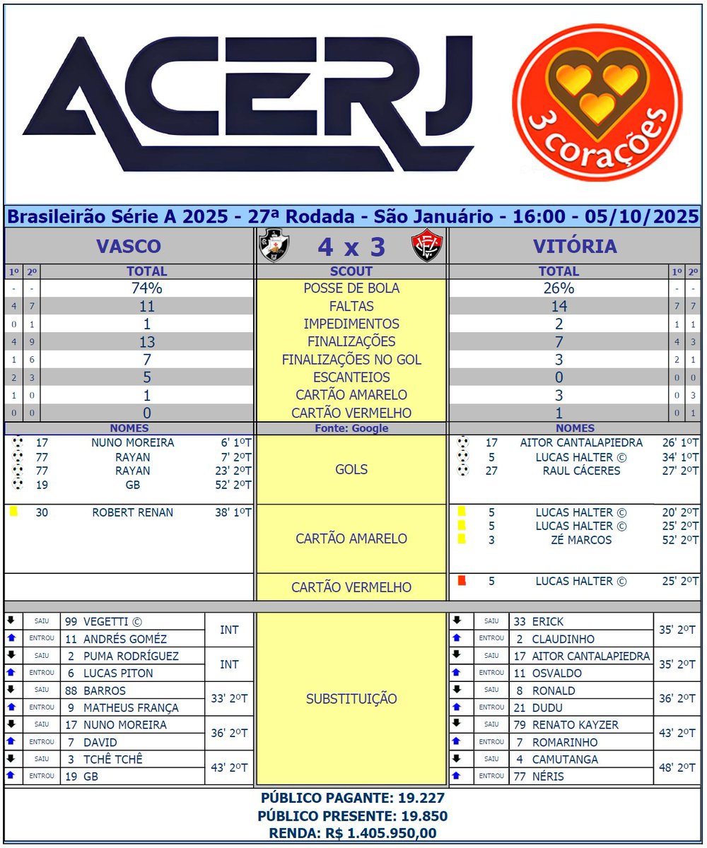 Scout da final entre Vasco e Vitória referente à 27ª Rodada do Campeonato Brasileiro 2025, que ocorrerá em São Januário. (Fonte: Google) #Acerjinforma #brasileirao2025 #VASxVIT #VascodaGama #ECVitoria @Brasileirao @VascodaGama @ECVitoria