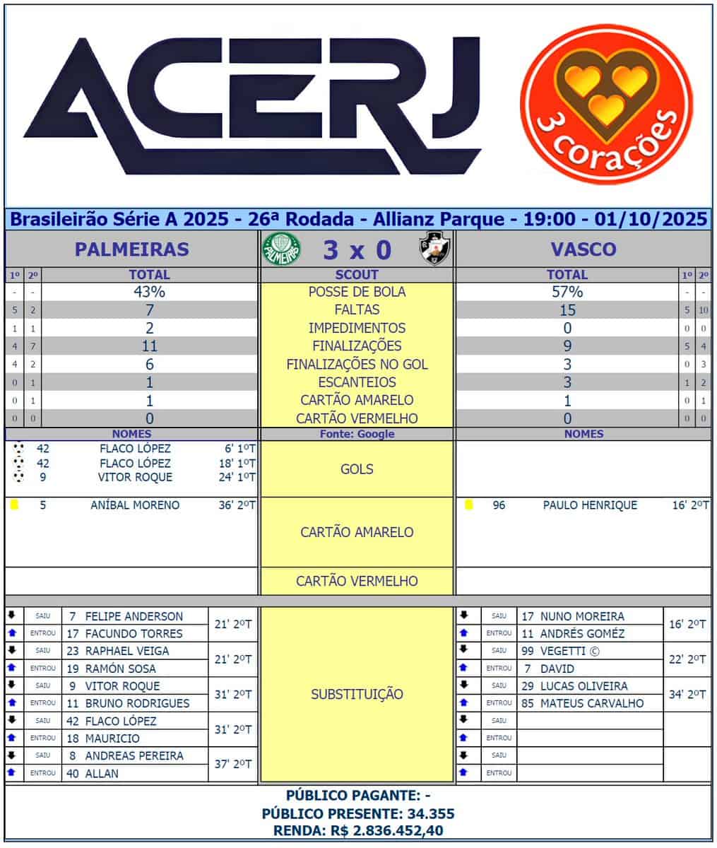 Scout para a partida final entre Palmeiras e Vasco na 26ª Rodada do Campeonato Brasileiro de 2025, que ocorrerá no Allianz Parque (Fonte: Google) #Acerjinforma #brasileirao2025 #PALxVAS #SEPalmeiras #VascodaGama @Brasileirao @Palmeiras @VascodaGama
