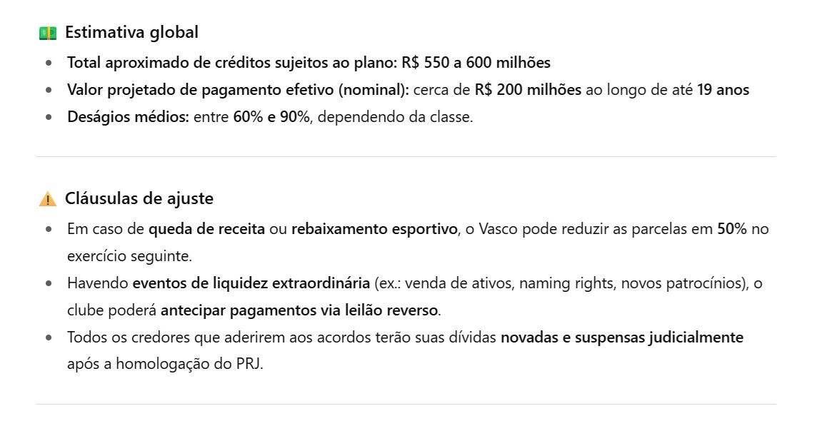 ⚙️ O Vasco terá a flexibilidade de ajustar parcelas em até 50% em casos de diminuição de receitas ou rebaixamento, além da possibilidade de antecipar pagamentos caso novas receitas sejam geradas, como vendas de ativos, naming rights ou grandes patrocínios.