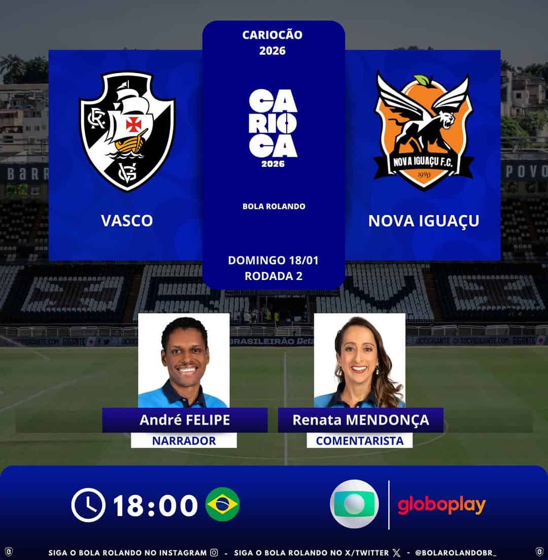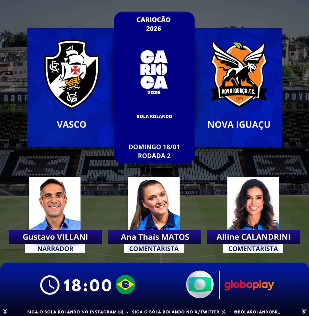 Equipe de transmissão de Vasco x Nova Iguaçu é revelada, destacando profissionais experientes na cobertura do futebol carioca.