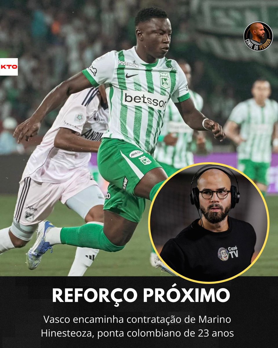 Um desejo antigo de Fernando Diniz está próximo de se concretizar com a chegada do colombiano Marino Hinestroza, de 23 anos, ao Vasco da Gama. O Canal do Pedrosa apurou que o jogador, que estava prestes a se transferir para o Boca Juniors, teve sua negociação interrompida pelo Cruz-Maltino, que encaminhou a compra do ponta por 5 milhões de dólares. Com detalhes finais sendo ajustados, ele chegará do Atlético Nacional, da Colômbia.