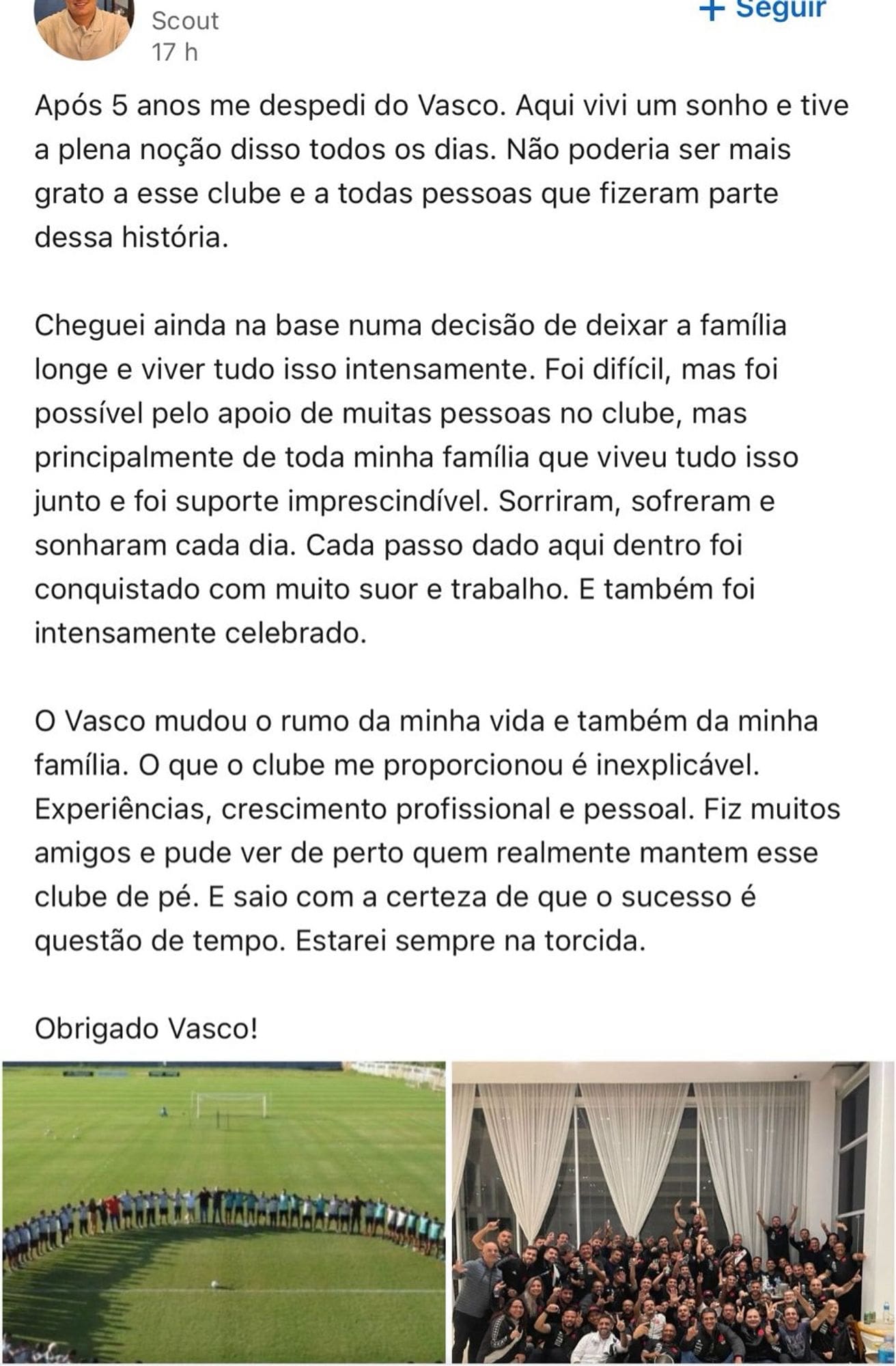 O coordenador do departamento de scout do Vasco da Gama anuncia sua saída do clube, deixando os torcedores surpresos com a notícia.