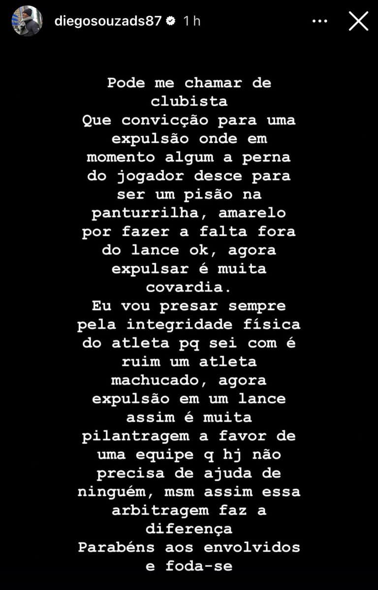 Diego Souza criticou a expulsão de Barros pelo árbitro, chamando a decisão de "covardia" em meio à partida do Vasco.