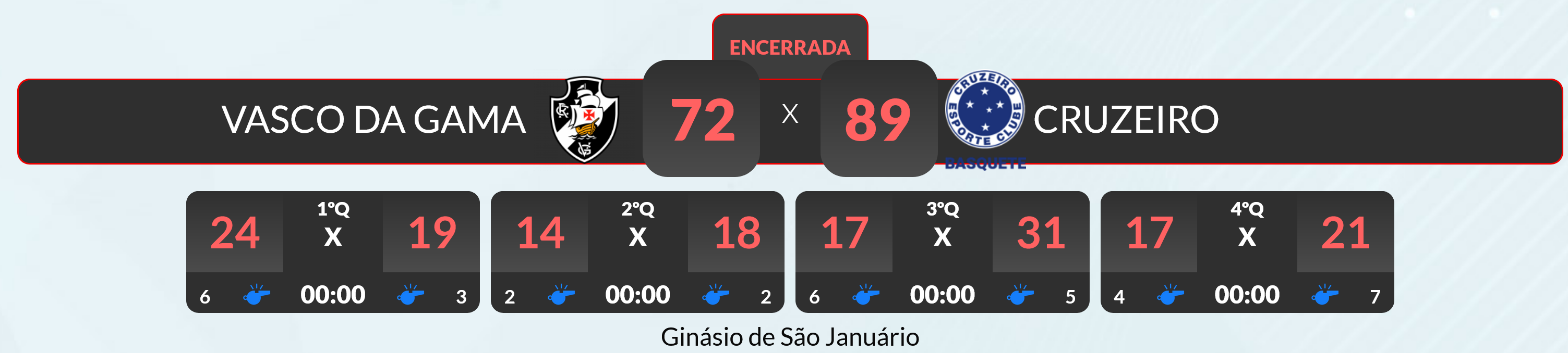 O Vasco foi derrotado pelo Cruzeiro por 89 a 72 no NBB, em partida realizada em São Januário. Com esse resultado, o time cruzmaltino perdeu a possibilidade de se manter fora da zona de rebaixamento.