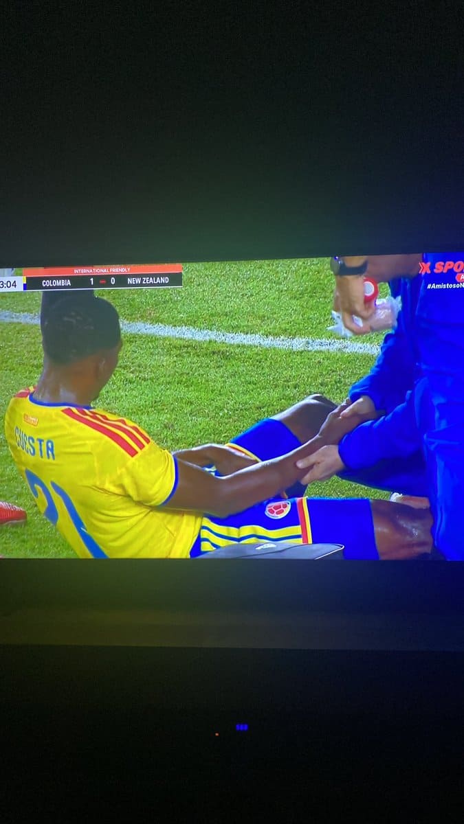 Assisti ao amistoso da Colômbia e a primeira cena que chamou minha atenção foi um choque em cima do braço do Cuesta. Ele está recebendo atendimento médico.