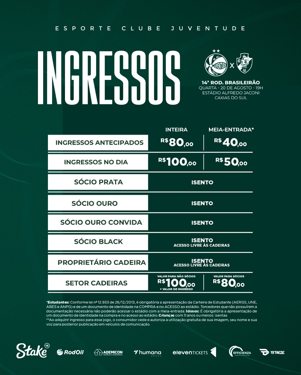 Os ingressos para o jogo contra o Vasco, que acontece na quarta-feira (20), já podem ser adquiridos. No sábado, o SAT funcionará em horário especial das 9h às 15h, sem intervalo para o almoço.