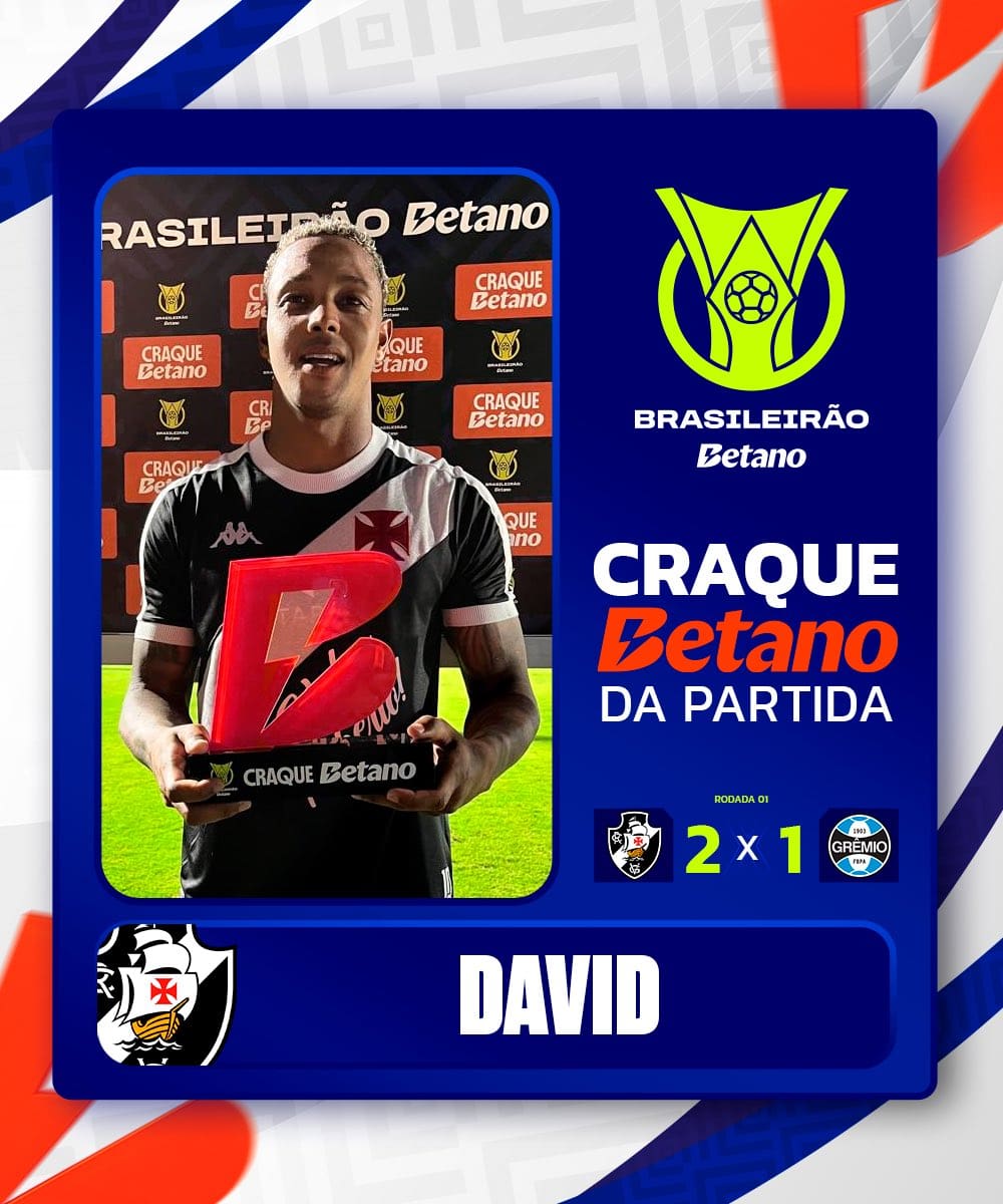 David recebeu o título de destaque do jogo Vasco 2 x 1 Grêmio, patrocinado pela Betano. ⚽🏆