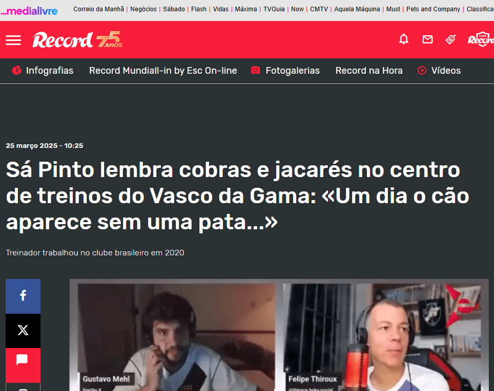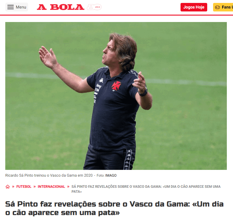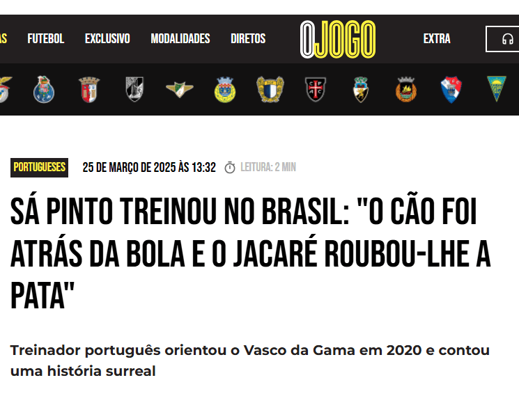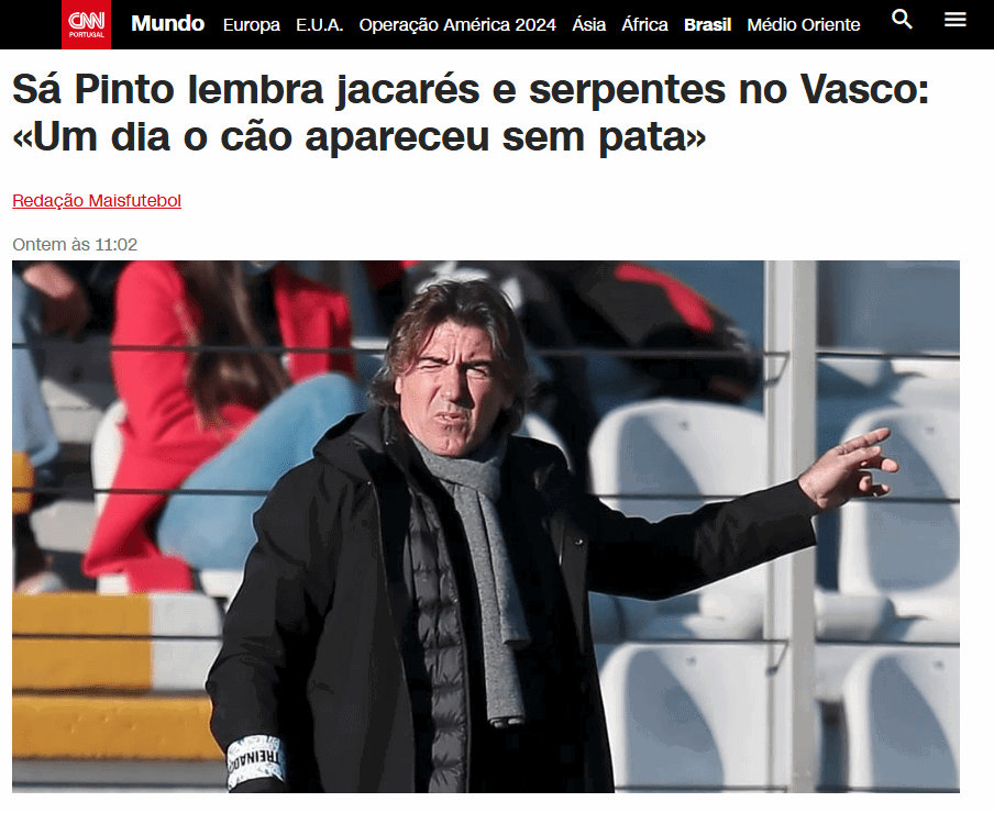 Declaração do treinador Ricardo Sá Pinto sobre jacaré no CT do Vasco ganha destaque em Portugal