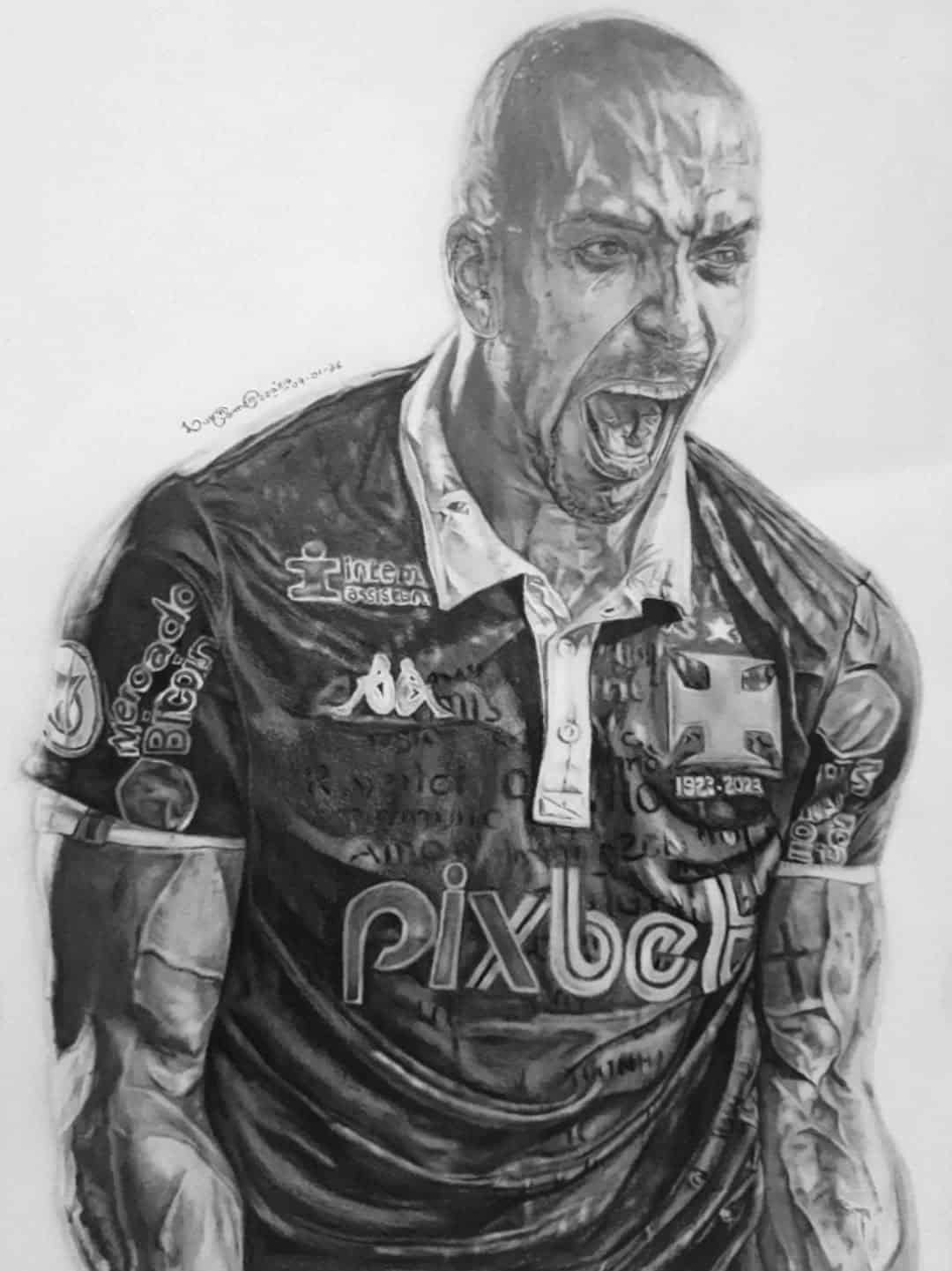 O artista Luangomesarts compartilhou um novo desenho do lateral-direito Paulo Henrique, um dos destaques do Vasco nas últimas temporadas e que já integrou a seleção brasileira. A imagem retrata um momento marcante em uma partida contra o Bragantino, onde Paulo Henrique fez uma jogada impressionante, cruzando para Serginho e evitando uma situação adversa. A foto que inspirou o desenho foi capturada pelo fotógrafo Lucas Almeida.