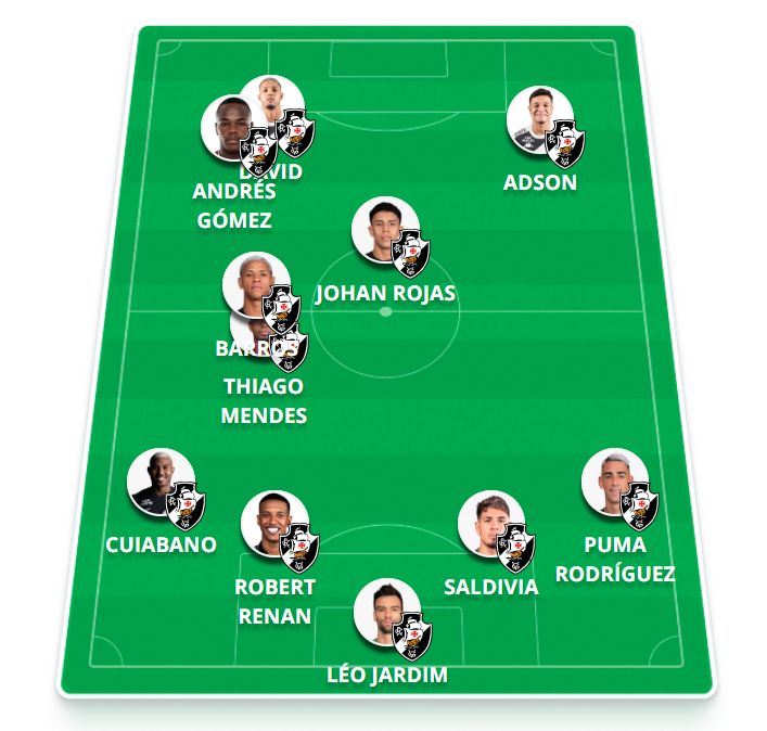 A provável escalação do Vasco é: Léo Jardim; Puma, Saldívia (Cuesta), Robert Renan, Cuiabano; Barros, Thiago Mendes; Adson, Rojas, Andrés Gómez e David (Brenner ou Spinelli).