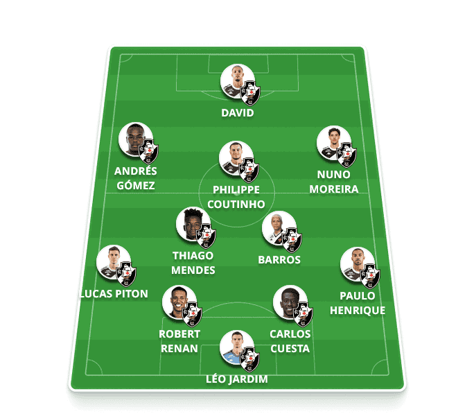 Provável escalação do Vasco: Léo Jardim, Paulo Henrique, Cuesta, Robert Renan, Lucas Piton (Puma); Barros, Thiago Mendes, Coutinho; Andrés Gómez, Nuno Moreira e David (ou GB).