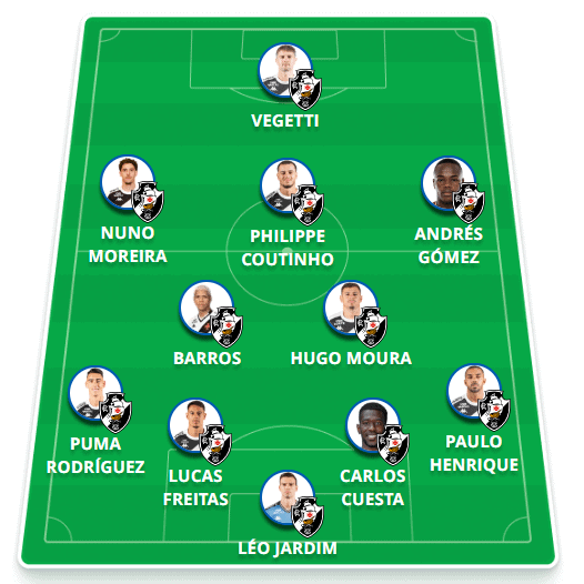 A provável escalação do Vasco conta com: Léo Jardim; Paulo Henrique, Carlos Cuesta, Lucas Freitas, Puma Rodríguez; Hugo Moura, Barros, Coutinho; Andrés Gómez, Nuno Moreira (David) e Vegetti.