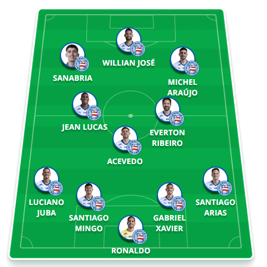 A escalação provável do Bahia é: Ronaldo, Santi Arias [Gilberto], Gabriel Xavier, Ramos Mingo e Luciano Juba; Acevedo, Jean Lucas e Everton Ribeiro; Michel Araujo [Kayky ou Cauly], Sanabria e Willian José.