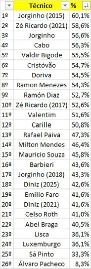 Elaborei um ranking que apresenta os percentuais de aproveitamento de cada um deles, excluindo os interinos.